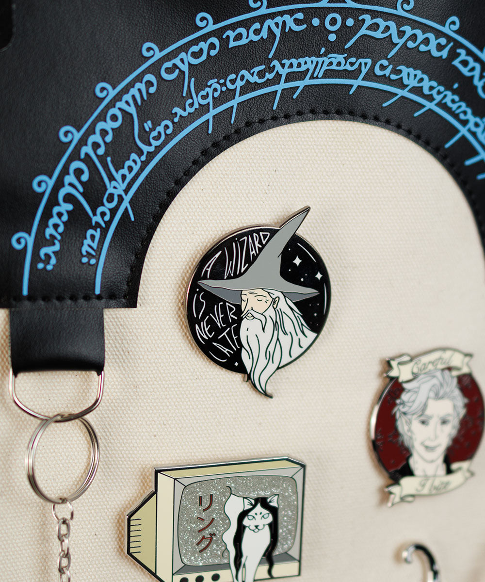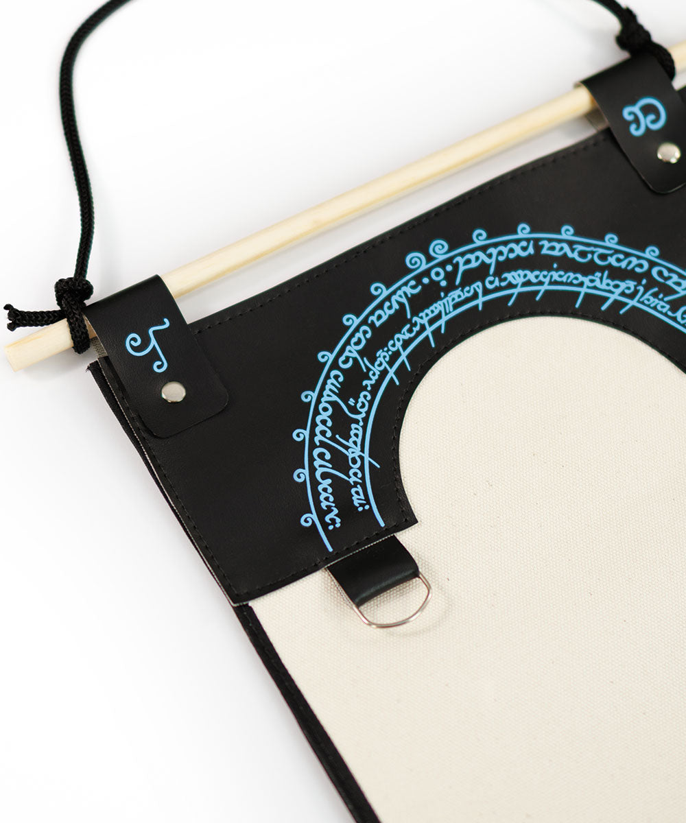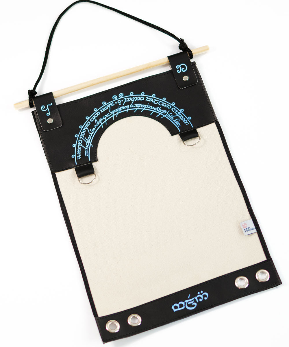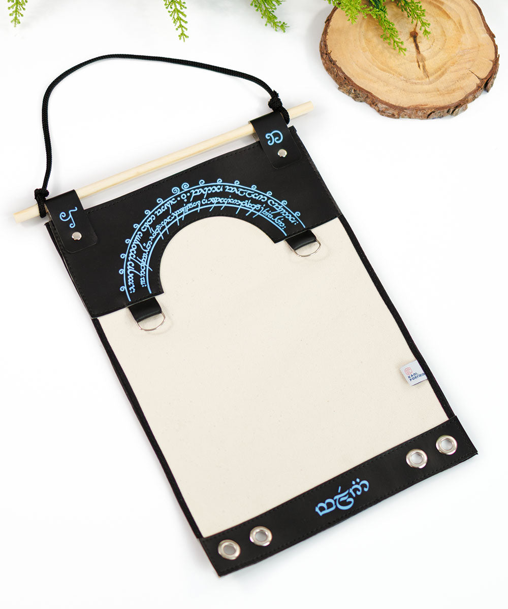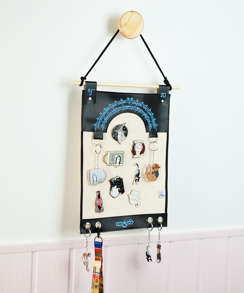 Essa bandeira decorativa foi feita para você expor seus pins, bottons e chaveiros enquanto não está os usando. Possui design com detalhe de couro sintético, personalizado, temático Senhor dos Anéis. 🍃