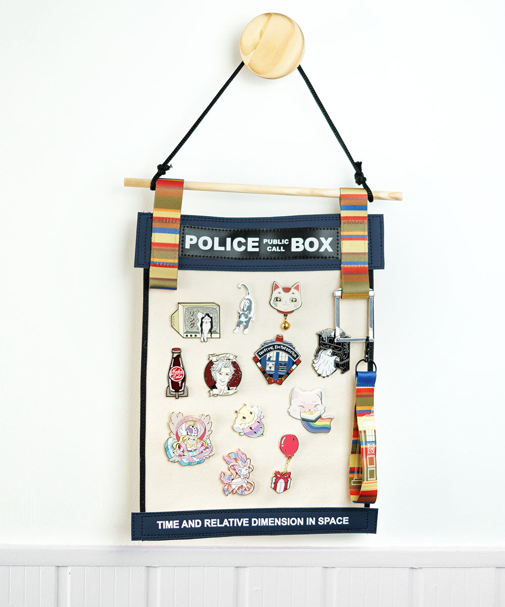 Essa bandeira decorativa foi feita para você expor seus pins, bottons e chaveiros enquanto não está os usando. Possui design com detalhe de couro sintético, personalizado, temático de Doctor Who. 💙
