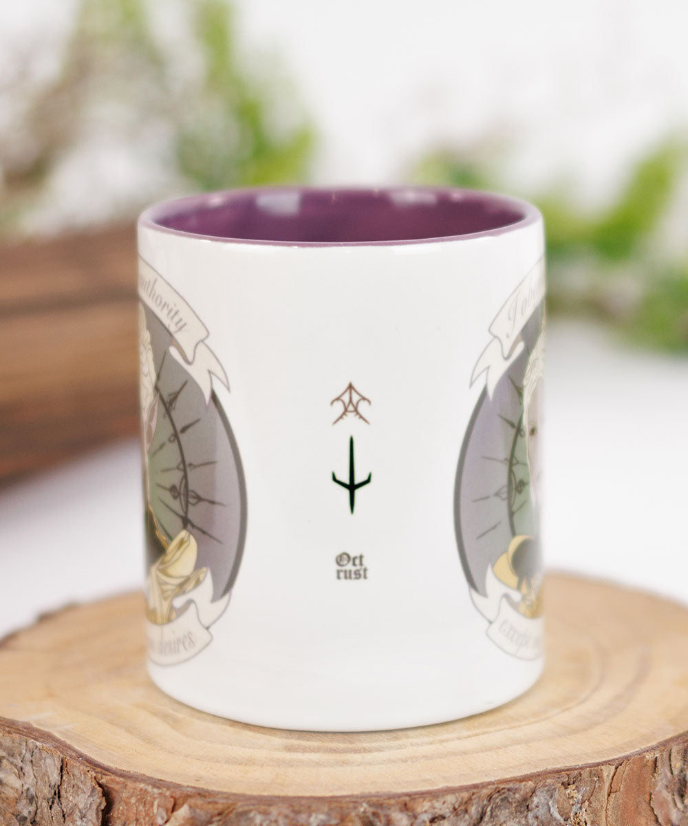 Caneca branca de cerâmica de 300 ml, sendo as medidas: 10 x 8 cm com ilustração digital. Possui alça e interior na cor verde.